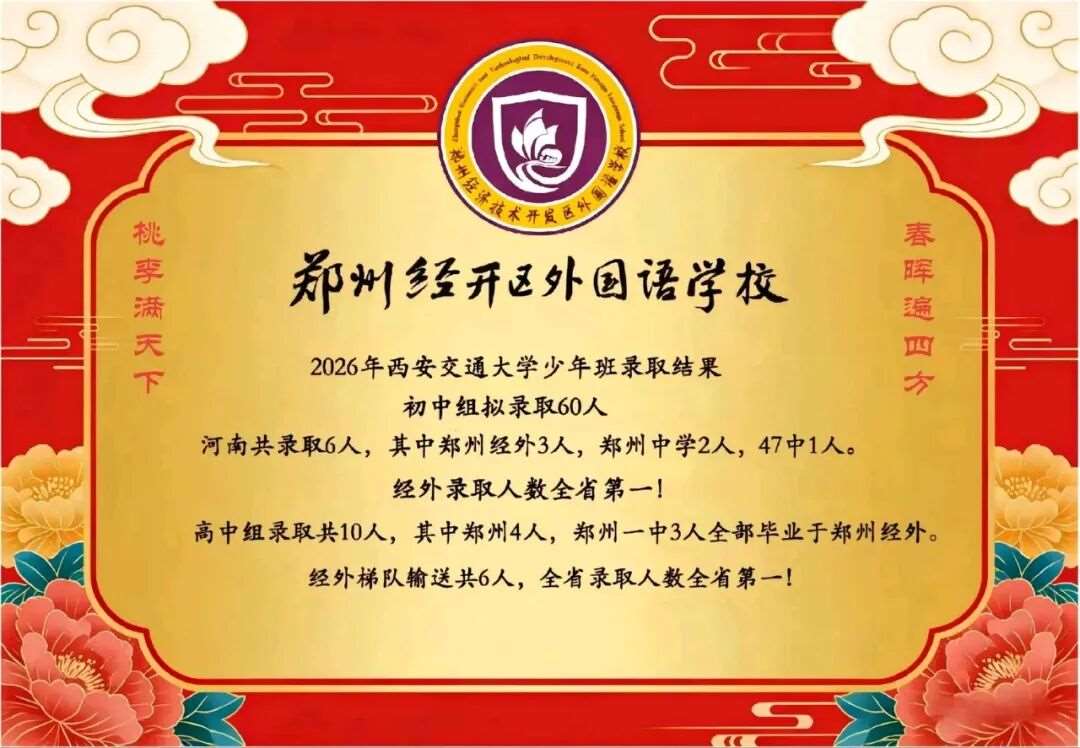 河南初中录取6人,其中经外3人,郑州中学2人,47初中1人。经外录取人数全第*!