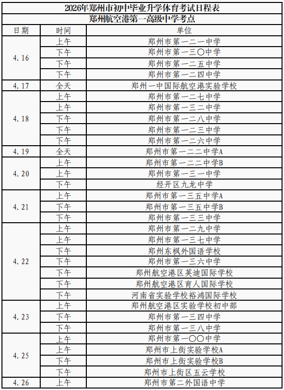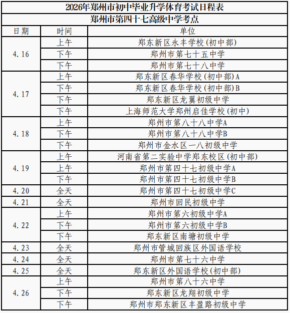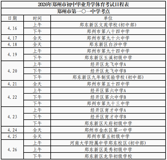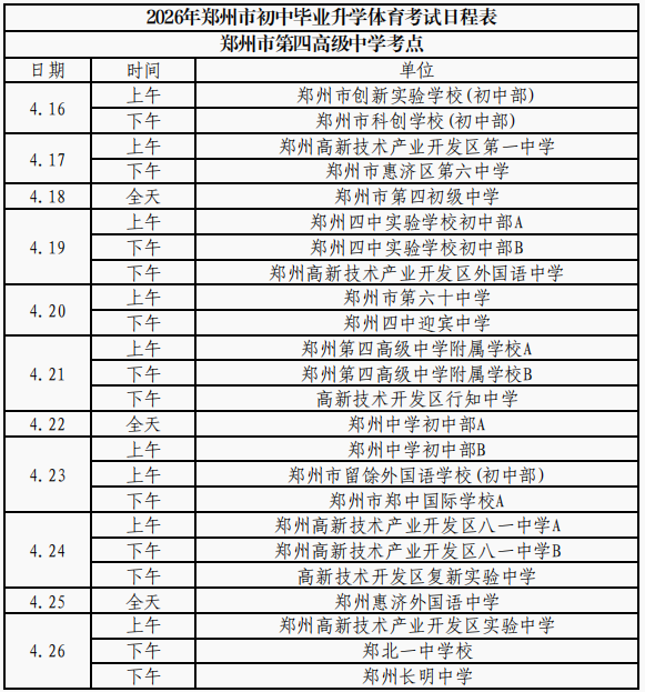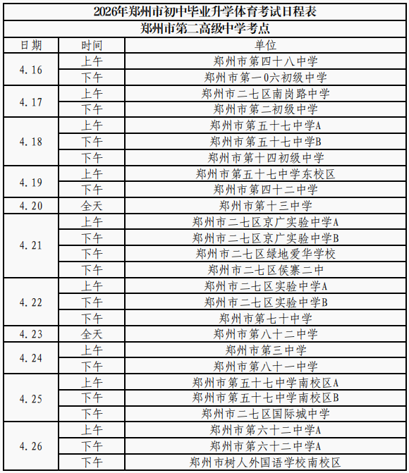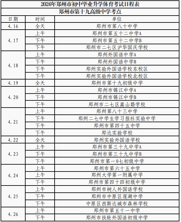 2026年郑州市区初中毕业升学体育考试日程表出炉!
